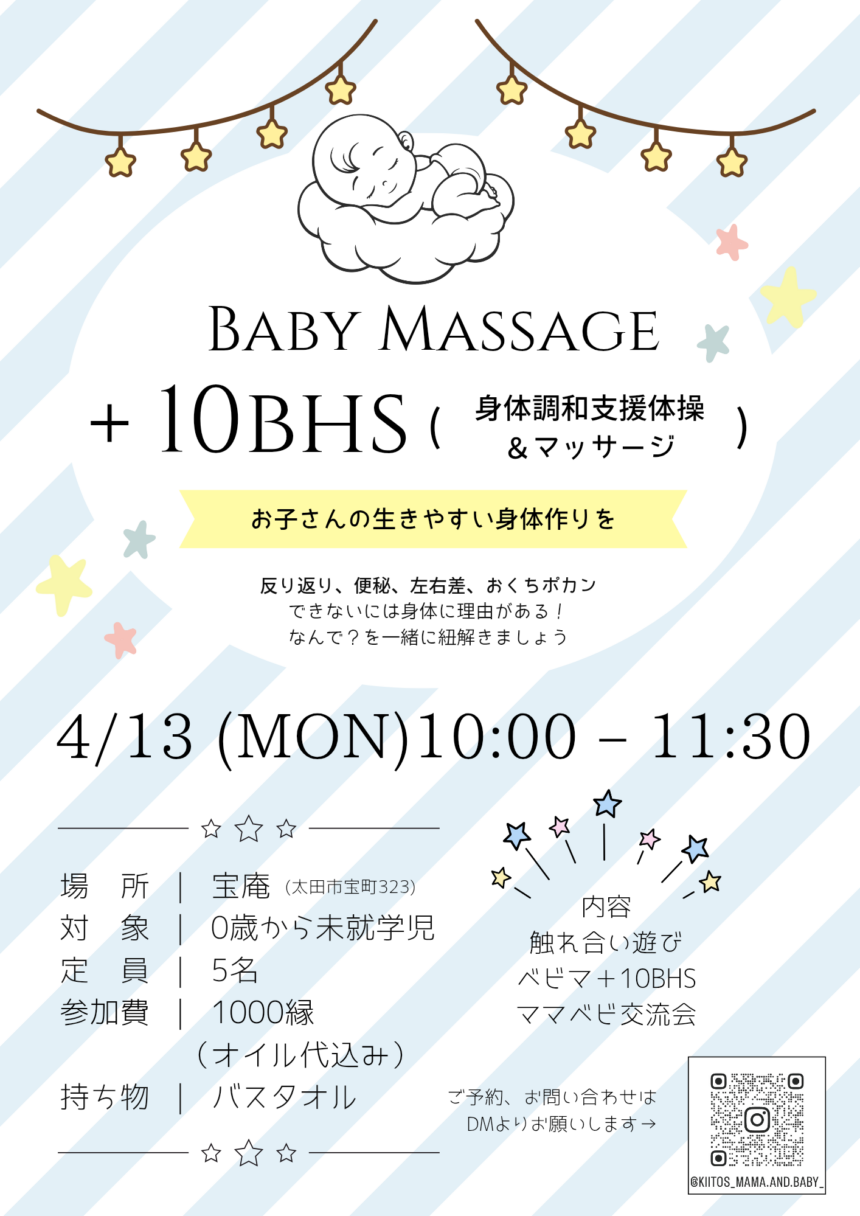 【4/13開催】ベビマ+10BHSで、お子さんの「生きやすい身体」作り